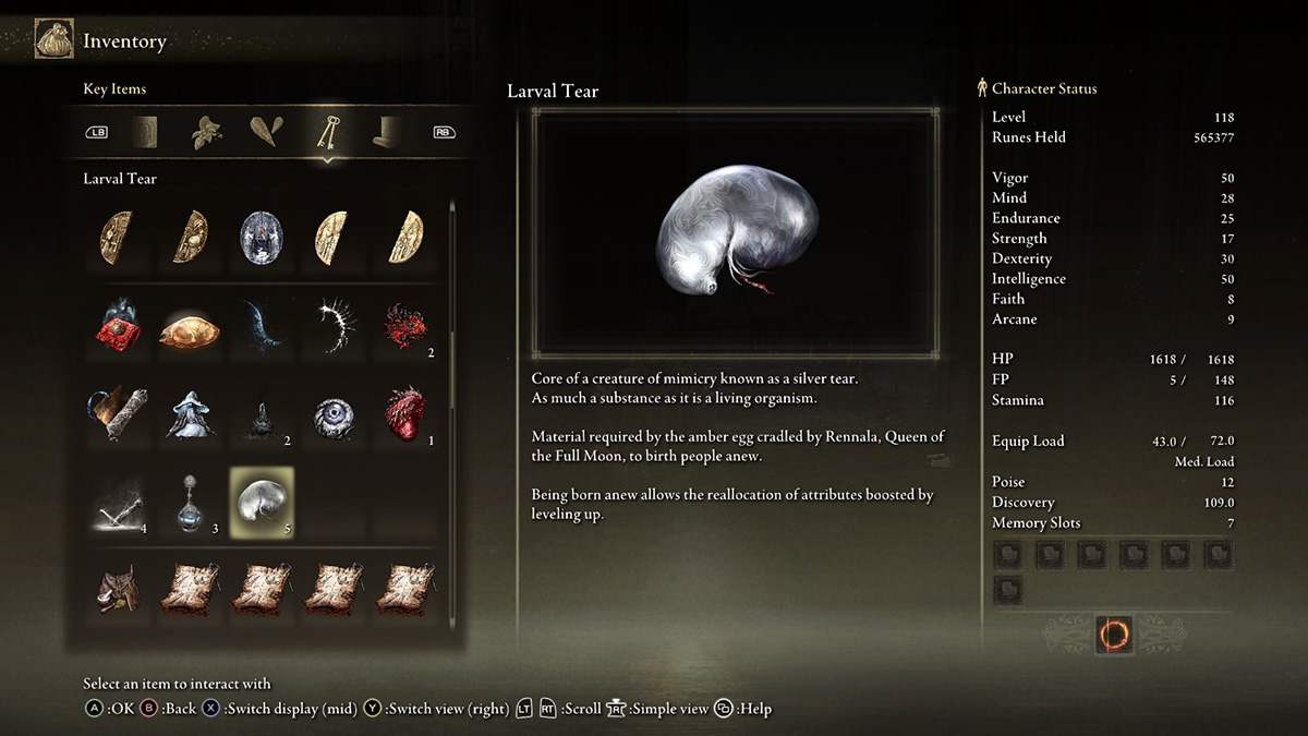 Note that you only spend your Larval Tear if you go through with the respec. If you back out of the Rebirth menu completely and hear Rennala’s dialogue saying, “Be not alarmed or afeared,” you’ll keep that Larval Tear for your next attempt. However, once spent, there’s no way to get more than the 17 you can earn per playthrough, as Larval Tears are key items and thus cannot be dropped by other players, similar to how you need to earn Flask upgrades, Great Runes, and other story-specific items with each new game cycle.