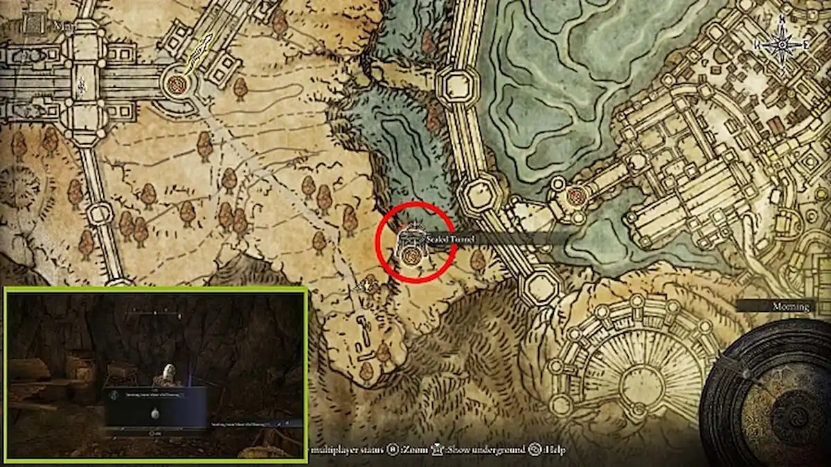 The second Smithing-Stone Miner’s Bell Bearing is in the Capital Outskirts outside the capital city of Leyndell, at the southern tip of a small lake outside the city’s western wall. Called the Sealed Tunnel, it’s marked on your map as a red and black splotch.
