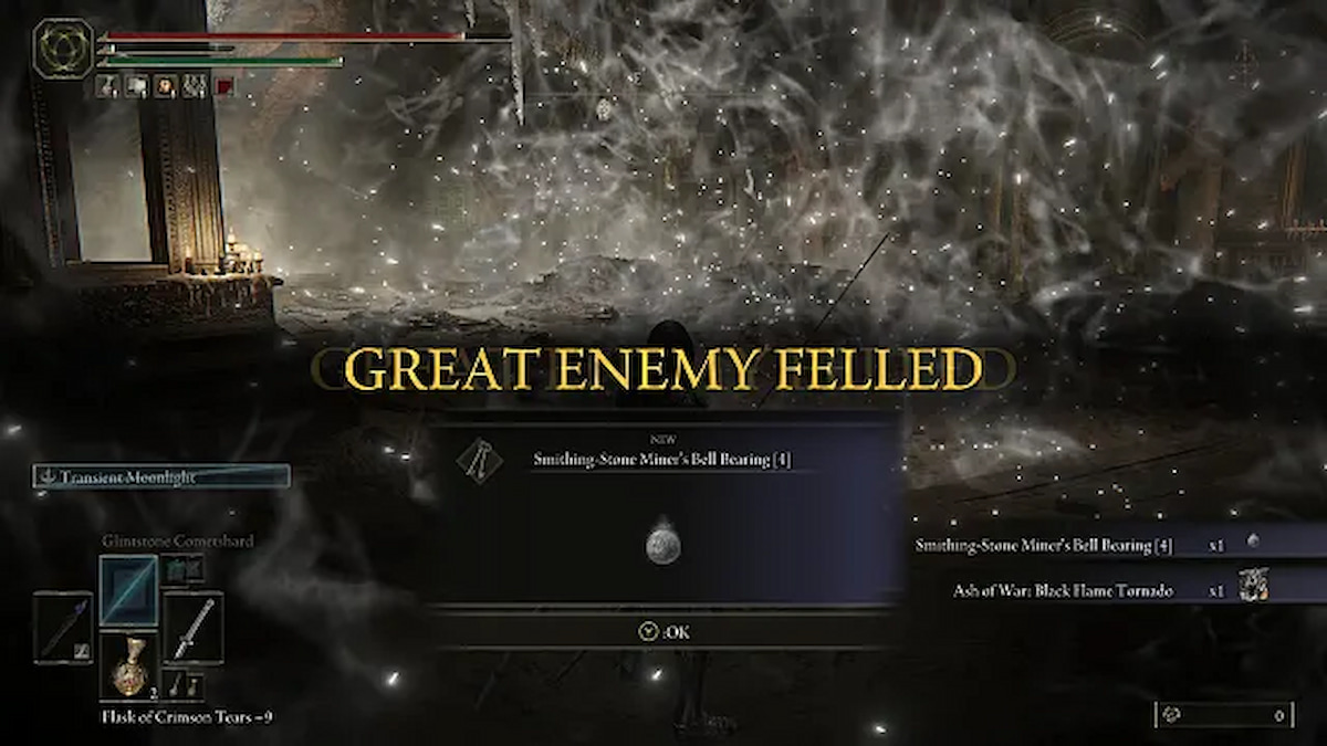 The final Smithing Stone Bell Bearing is a reward for what I consider the most annoying obligatory bosses in all of Elden Ring: the Godskin Duo. No wonder they have a spot on our top 10 hardest bosses list. They’re located in Crumbling Faram Azula, reachable after setting the Erdtree aflame in the Mountaintops of the Giants. Should you manage to defeat the Godskin Duo, you’re rewarded with Smithing-Stone Miner’s Bell Bearing 4. You’ll be able to purchase up to Smithing Stone 8 with this item, taking weapons to +24.