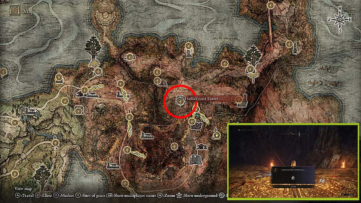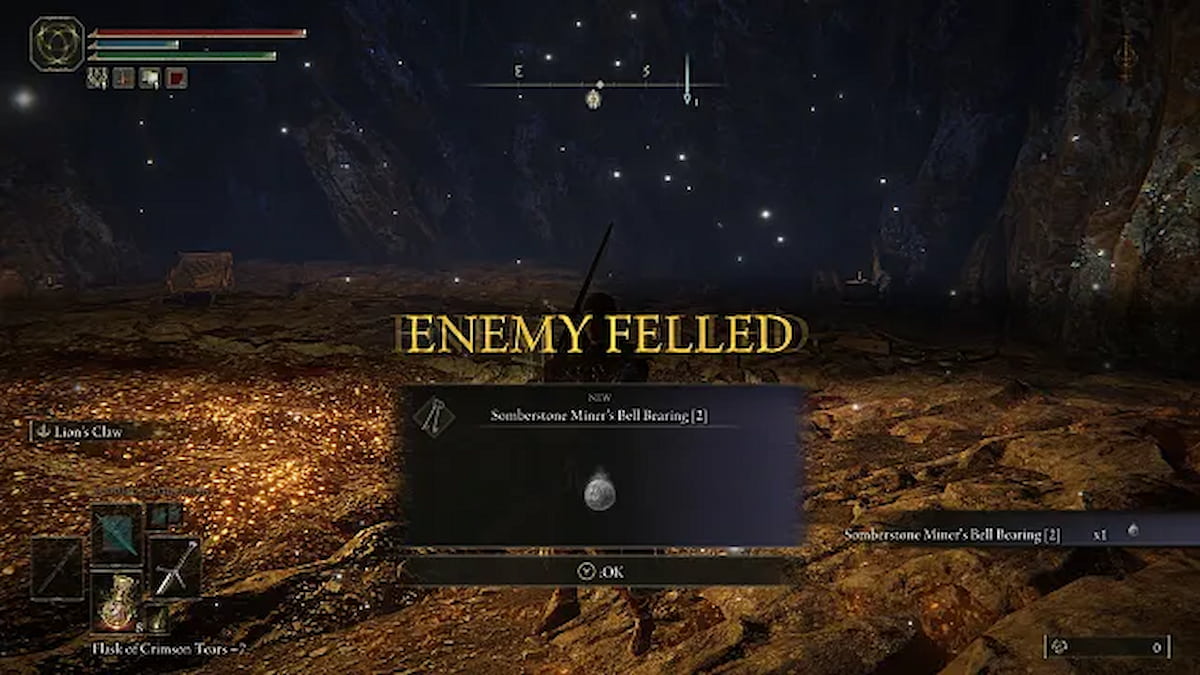 Northwest of Sellia, Town of Sorcery is the Sellia Crystal Tunnel. Making your way to its bottom has you fighting the Fallingstar Beast in an arena entirely too small for the distance its attacks cover. Defeating it, however, awards the Somberstone Miner’s Bell Bearing 1, which allows you to purchase up to Somberstone 2. With it, you can upgrade your unique weapons to +2.