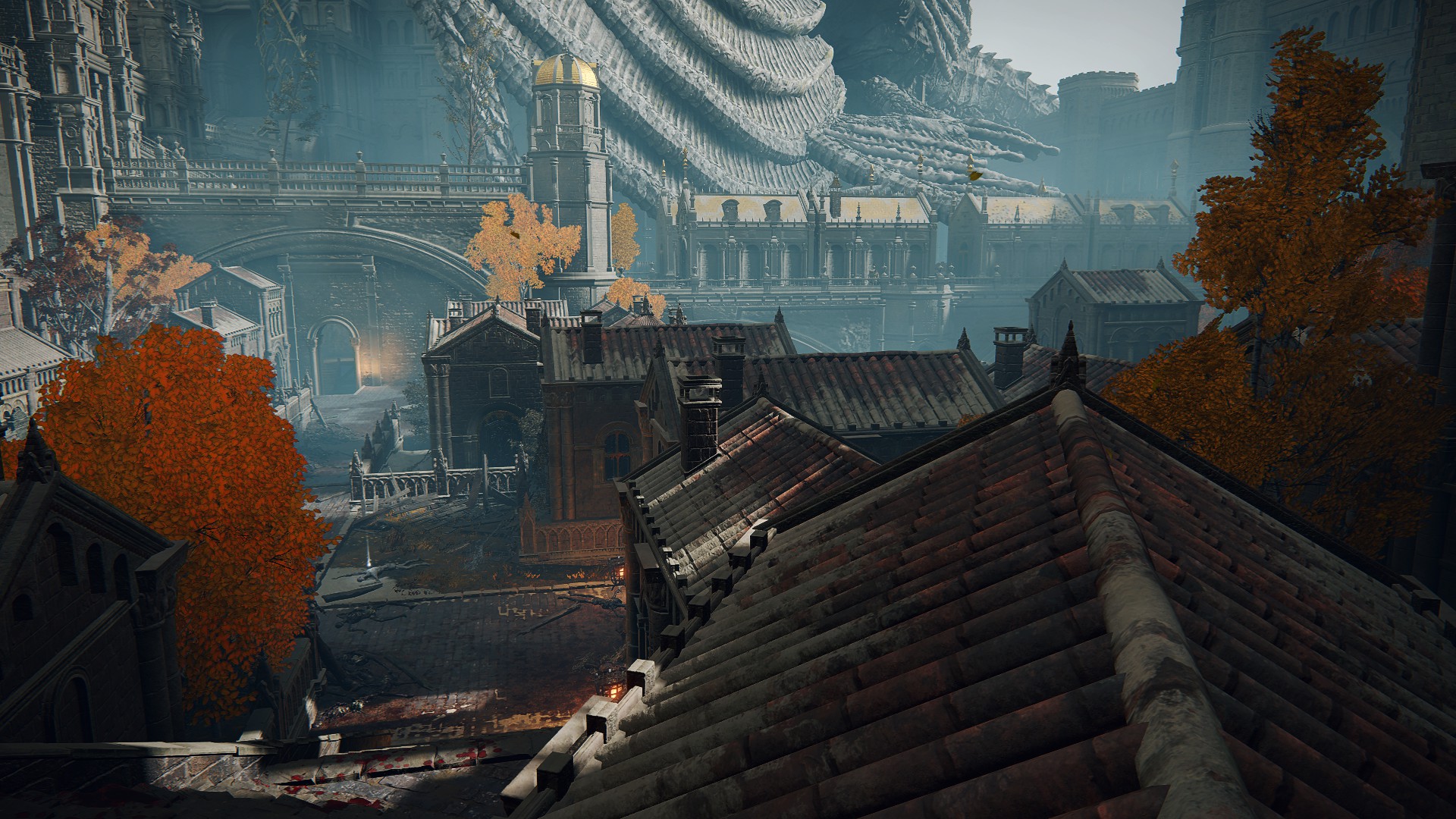 To the right of the square is a hall with a Crucible Knight in it. Don’t go that way. Instead, take the elevator across from it down and exit.