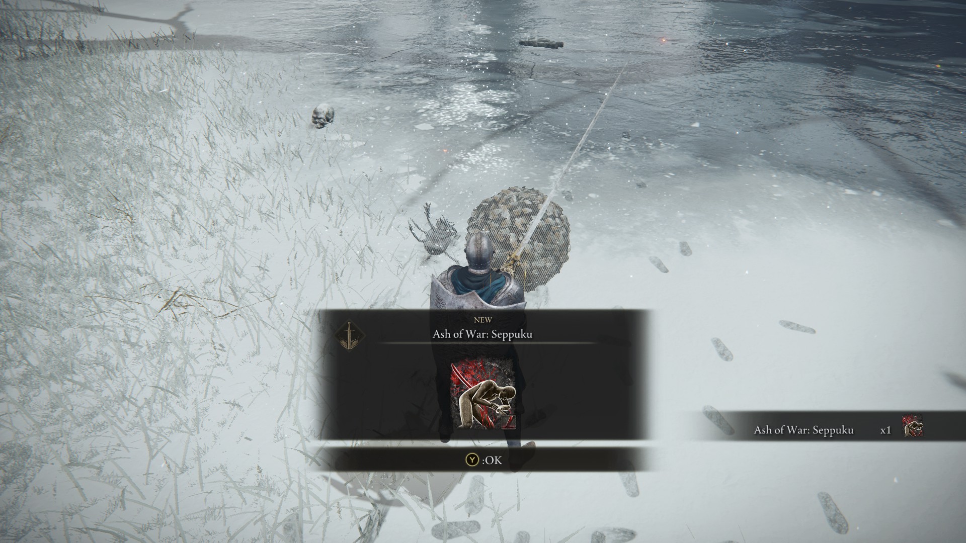 Start your journey to the Seppuku Ash of War in Mountaintops of the Giants. There’s a frozen lake at the far northwest portion of the Mountaintops of the Giants, reachable only with the Rold Medallion you receive after defeating Morgott, the Omen King in Leyndell. Up the Grand Lift of Rold, across the chain and rock bridges, and to the northernmost part of the large frozen lake is an invisible Teardrop Scarab.