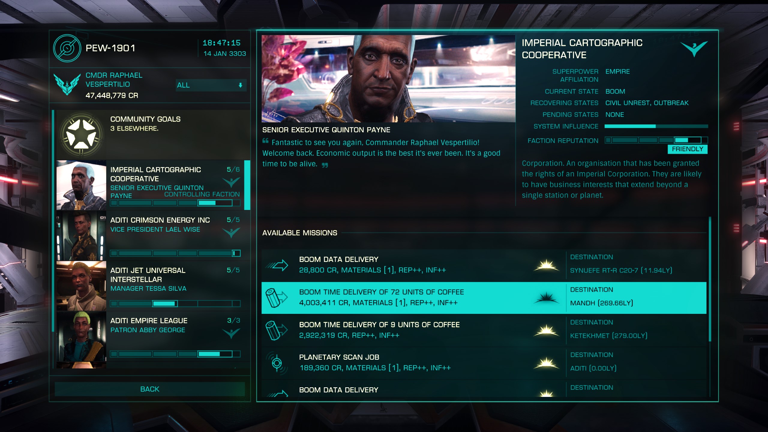 Each system will provide players with Boom Missions, but some systems are better than others, providing higher volumes of Boom Missions than others. One of the better examples of this is the Aditi system. This system is often chosen by players connected with the Empire as it is dominated by Imperial Factions. It’s also great because it’s a fast way to increase your trade rank.