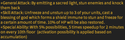 The biggest reason you see Priests in almost every high ranking team isn’t because of its unit skill kit or is it her healing capabilities. It’s because she has a chance to cast God’s Blessing and speed the game up by 5x every 10 floors for 2 minutes (based on accumulation). That is a massive speed increase that will make your runs go faster, which in turn makes you accumulate medals faster.