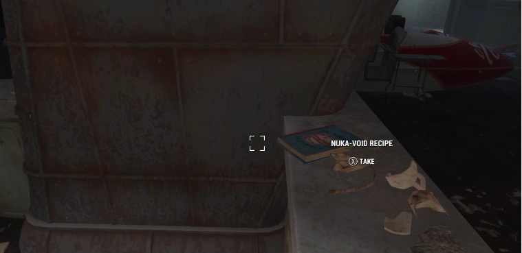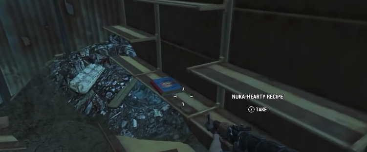 You can pick up this recipe book on a metal shelf (along with some empty Nuka Cola bottles and burnt books) in the RobCo Battle Zone of the Galactic Zone attraction