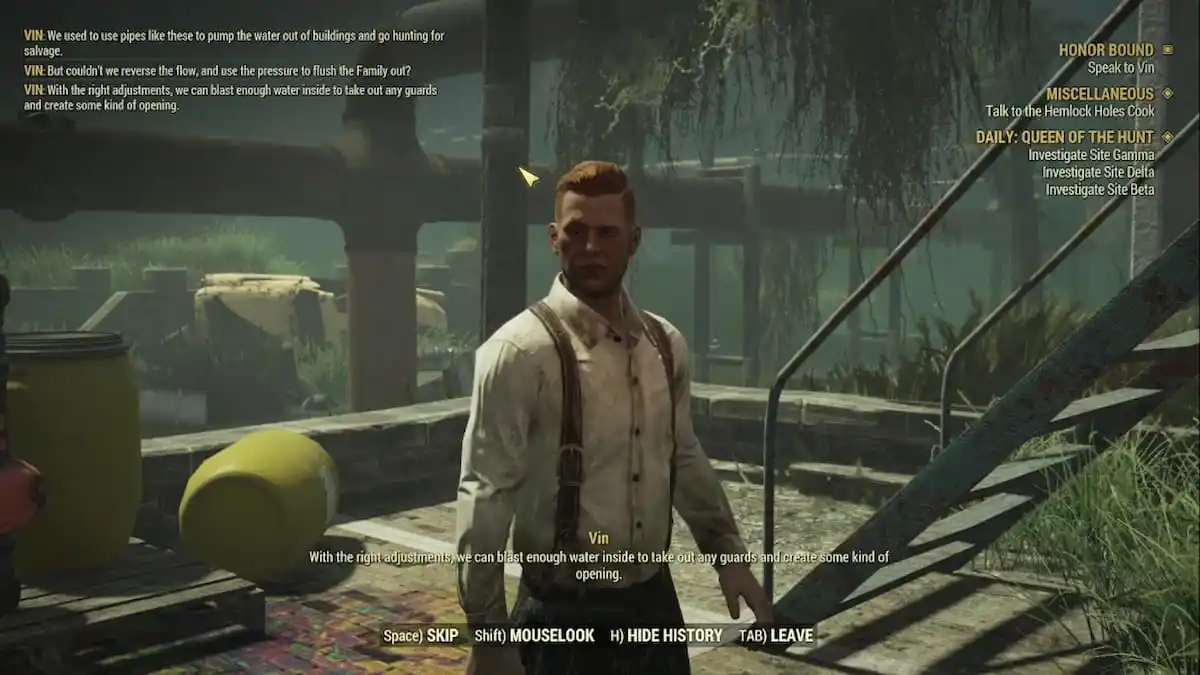 When you arrive, speak to Vin to move the Honor Bound quest forward. He mentions how they use the water valves to drive Overgrown out of the area. Instead of spraying the water out, this time, you’ll spray the water into the lab and drive the Family guards out.