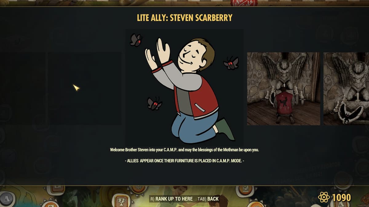 As with previous seasons, Season 12 in Fallout 76 introduces us to a new lite ally. Steven Scarberry is available to unlock at space 35 on the scoreboard. Bringing with him some of the Mothman cult and a slew of goodies to sell, he will also become available later in the season to purchase with Gold Bullion.