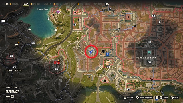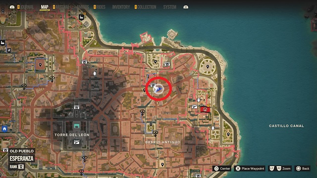 Follow the same road east, past the Mercurio Mecanico hideout. Take the first road left (north) after the hideout, and go through the E1 checkpoint. Follow the road around, and go through the next checkpoint. You’ll be in a large, open area. Go to the very back, and turn right to find the monument by an alarm.