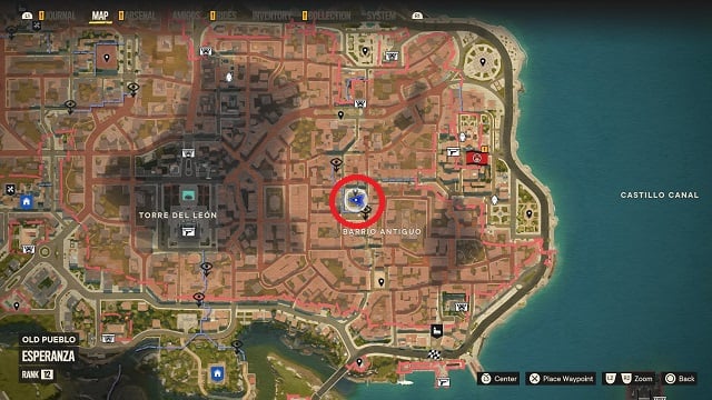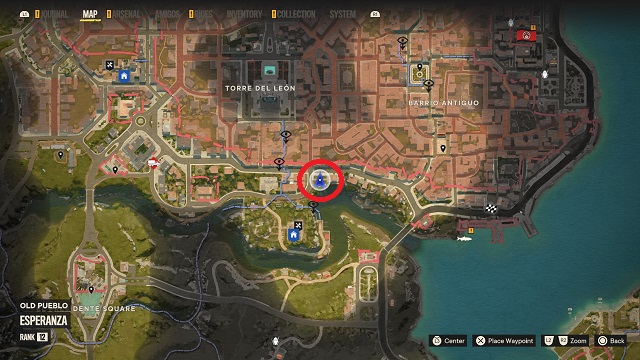 Now fast travel to Santa Leticia Square, and go northwest to Los Reyes Plaza. The statue is on the right side of the plaza, guarded by several soldiers and at least one elite with a dog.