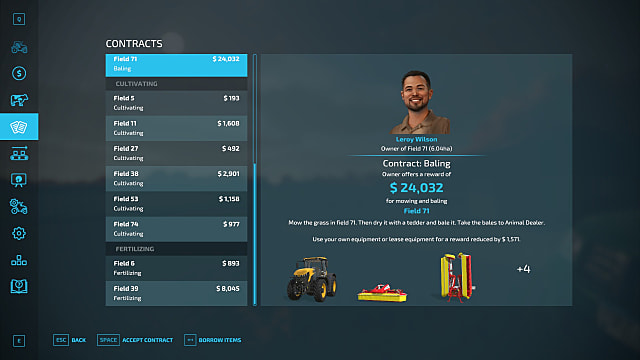 You can find contracts for all kinds of jobs, from harvesting and bailing to plowing and fertilizing. Another added benefit to taking contracts for cash is that it lets you rent equipment to do the job for a very cheap fixed price, so there’s no wear and tear on your tools. It’s a great chance to try out other equipment you might not normally try if, too.