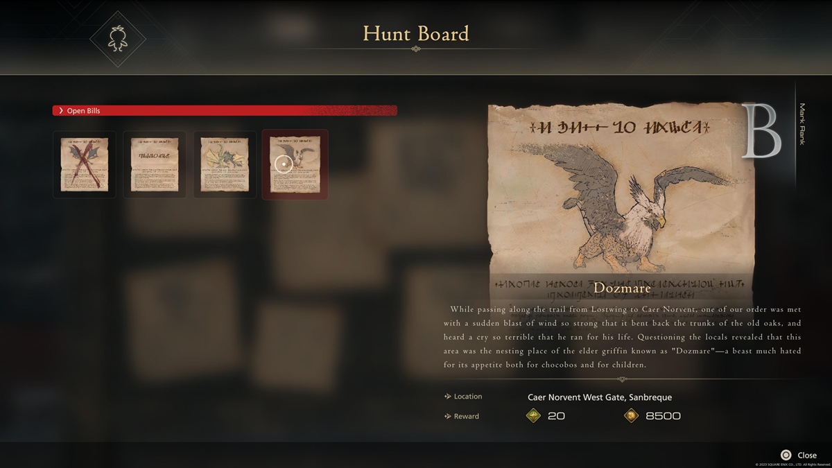 The next step in the Final Fantasy 16 Blacksmith’s Blues side quest is to ascertain the Dozmare Griffin’s location via the Hunt Board. Talk to Nektar the Moogle about it, and you’ll see a parchment that has the information. However, even after reading the document, the quest objective won’t progress. I’m not sure if this is a bug or if it’s working as intended.