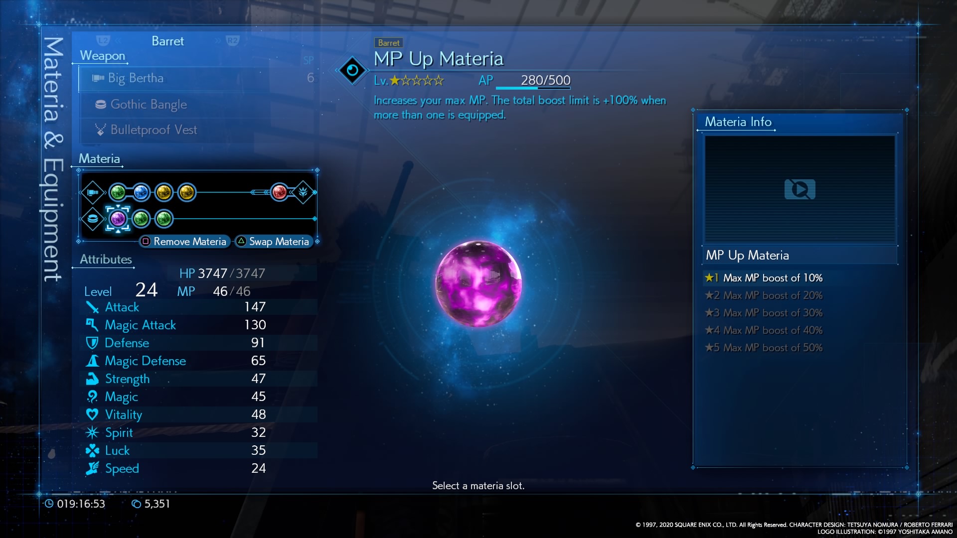 Location: You find MP Up sitting atop a construction platform on the H-01 platform in Chapter 6, the section before the second reactor bombing run. You’ll have powered down two plate lamps, and you’ll need to run past the third and down a ladder. Manipulate the crane to move the platform down to reach the materia. It becomes purchasable for 2,000 gil after that.