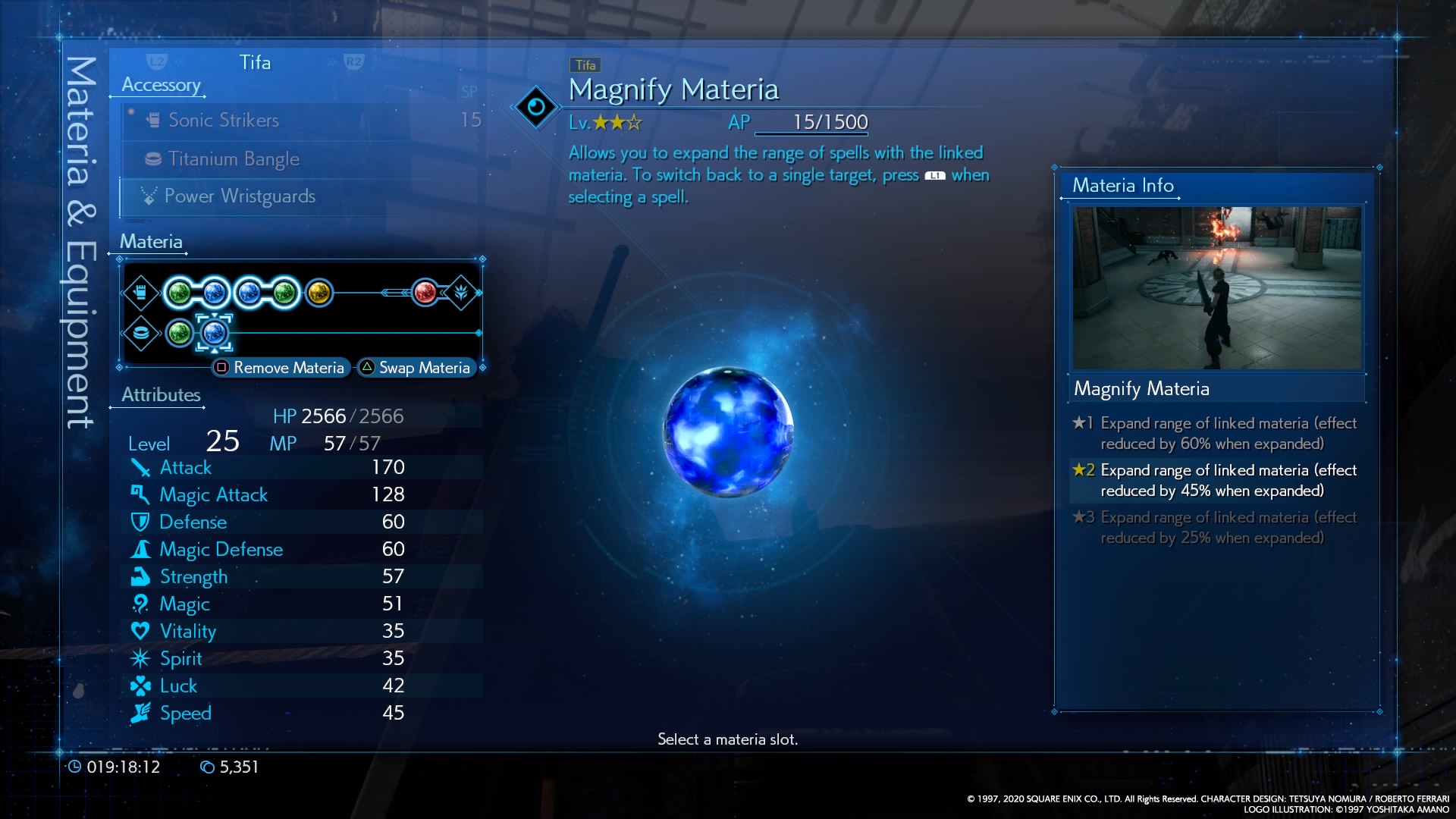The backbone of any solid materia combination, Support materia is only really useful when connected to Magic materia through linked slots. Each augments either the function of the connected materia or changes moment to moment combat in some way. Elemental materia, for instance, can empower your weapon with Fire, Ice, or Lightning; Magnify empowers the spell itself, and so on.