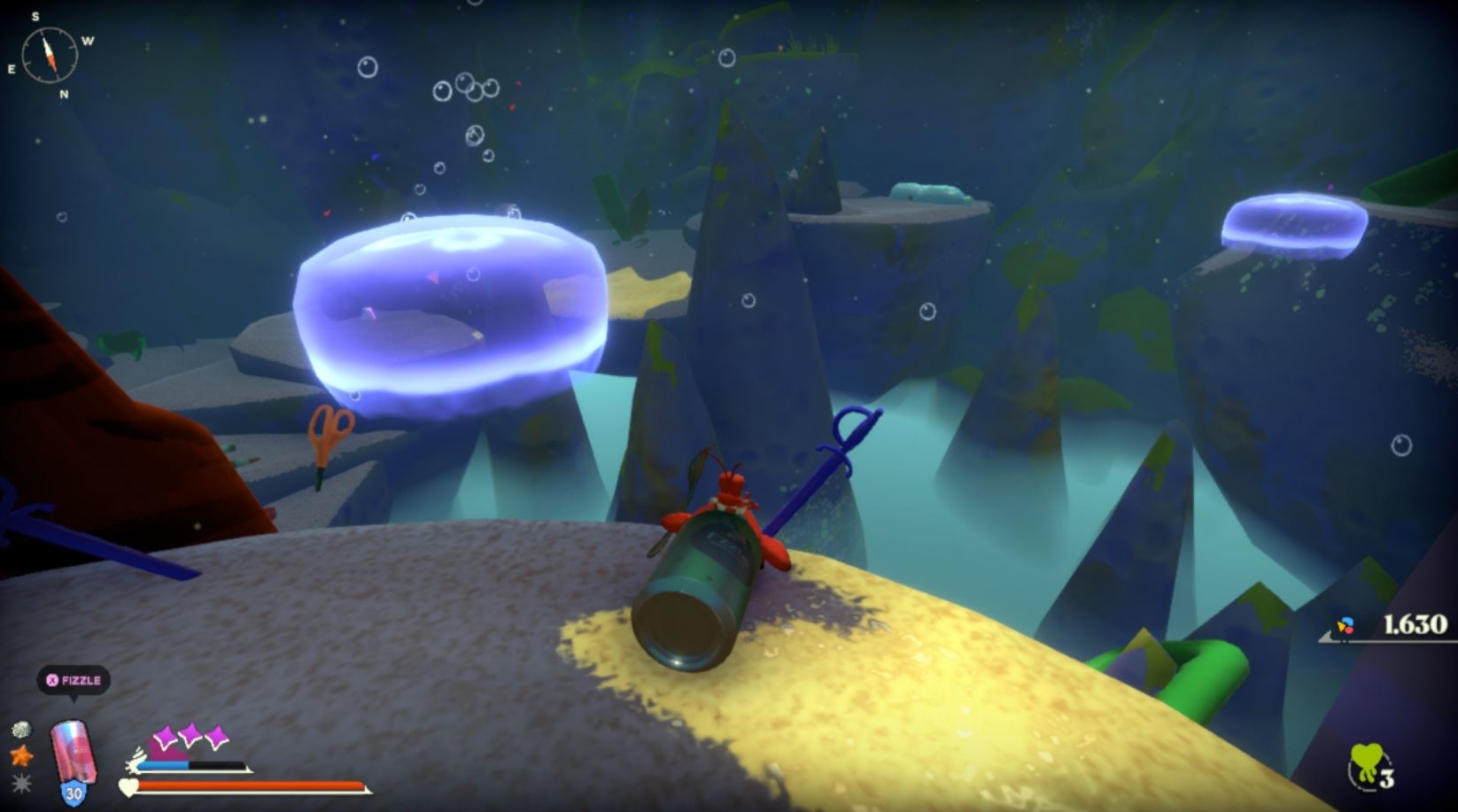 You need to look for a platform with four crabs toward the end of the level and turn around to face this ledge in the picture above. If you can see the final boss, don’t drop down. Go back to look for the ledge in the picture. It’s just across the way from the crab platform. You’ll spot it by the red bottle in the screenshot and a jellyfish elevator. Climb it, and you’ll see two blue plastic swords. Wait here for the jellyfish elevator to descend and jump on it.