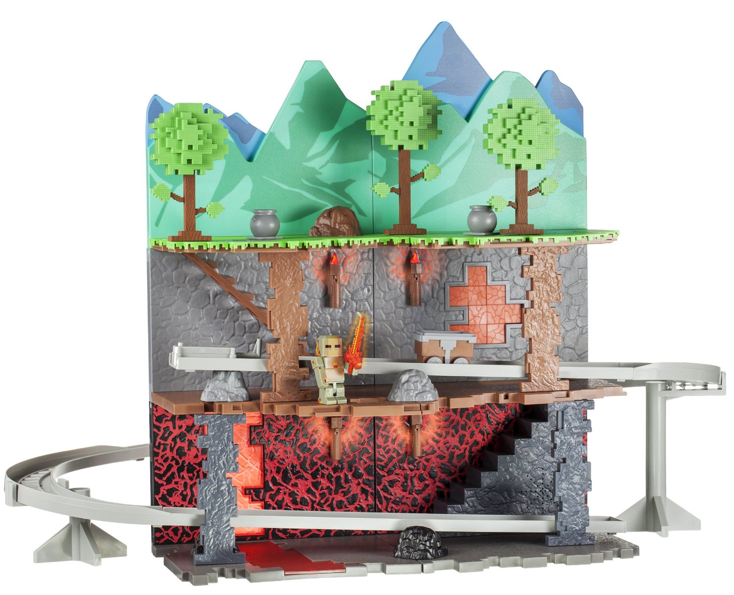 The Terraria multi-level biome playset stands at 18 inches tall and 29 inches wide. It includes a figurine with a light up sword and working minecart and track. You can also expand the set by adding the Corruption Biome pack which too comes with its own figurine. It is a set that is sure to give kids plenty of fun.
