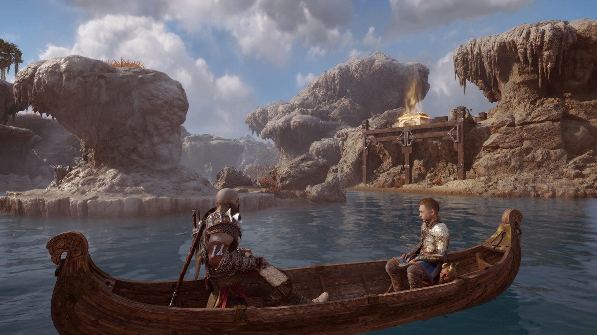 Get in the canoe after the Raven, and go straight ahead. Stay left past the tower with the cogs, and follow the waterway left past a camp on the right. Dock at the beach by the wheel blocking the way. Go straight, and use the Leviathan Axe to freeze the small geyser. Cross over, and turn right to freeze another geyser by the cliff. Climb up the cliff, and interact with the body near the top.