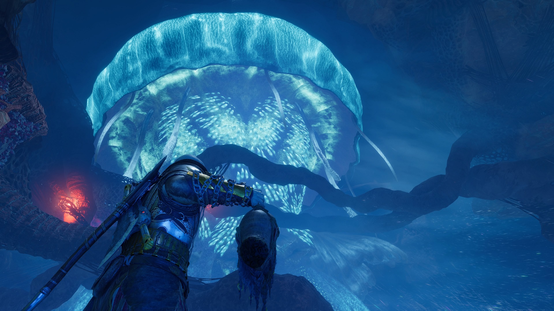 Now drop down, and go through the newly opened pathway. Defeat the enemies, and use the grapple point to reach a cave where you’ll climb up. At the top, you’ll meet Hafgufa, the animal you’ve been after