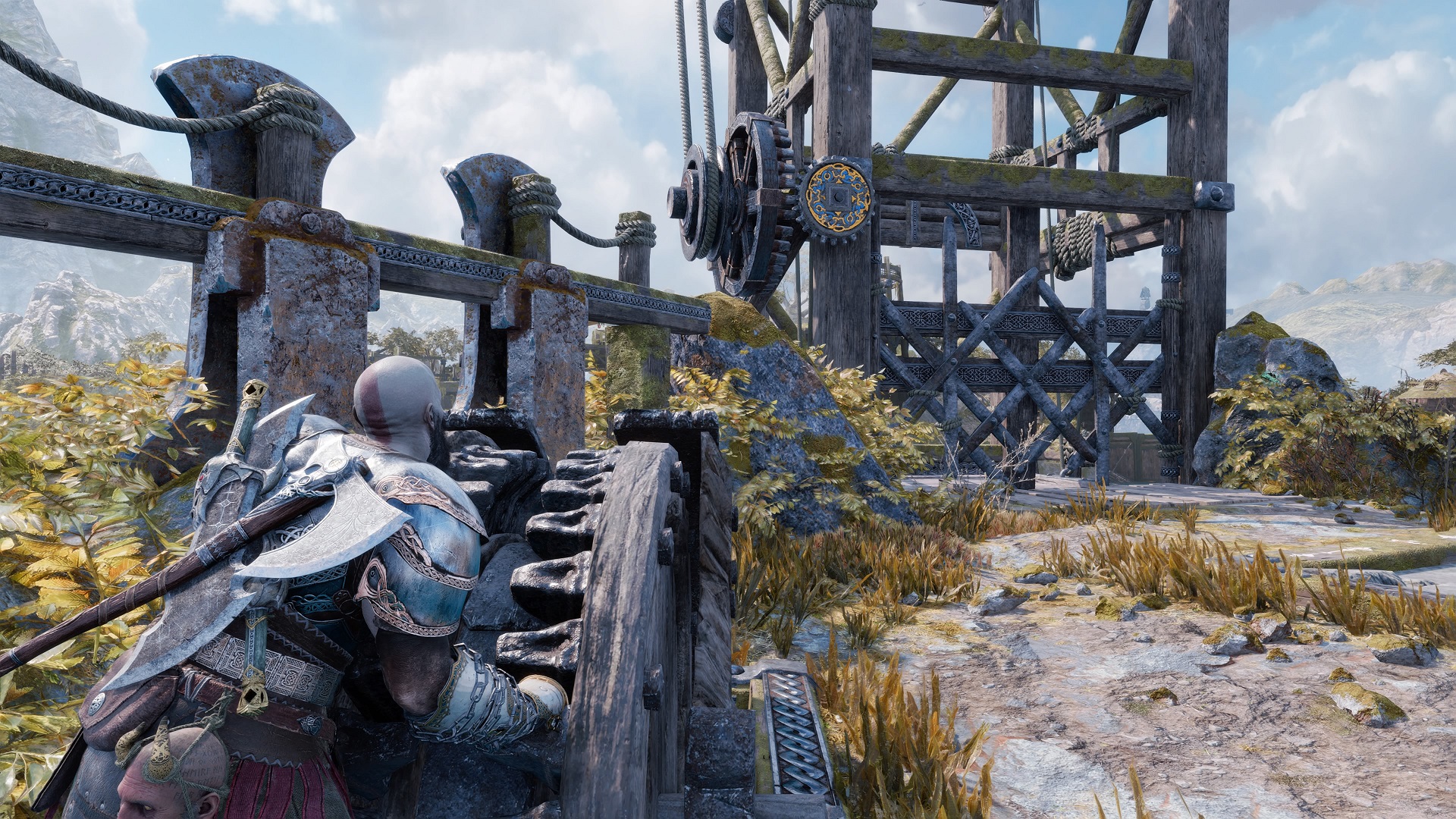 Without letting go, use the Leviathan Axe to freeze the blue gear on the elevator shaft. Leave the mechanism. To progress, go back to where you climbed up into the area, climb down, then right to get on top of the elevator. Once there, recall your Axe to send the elevator up.