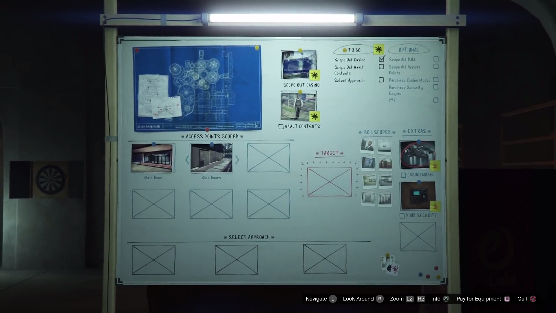 The first blackboard is dedicated to helping you set up your heist. You will see the “To Do” list in the upper right corner, which is a list of actions you must perform before the actual heist.