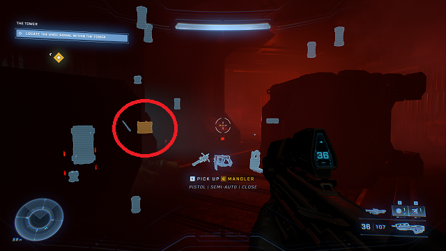 From the UNSC Audio Log, continue toward the objective marker. Go up to the third floor of the Tower, and go right at the top. Follow the path around, and look for an alcove on the left with the Spartan Core collectible. Use your scan here to highlight the chest.