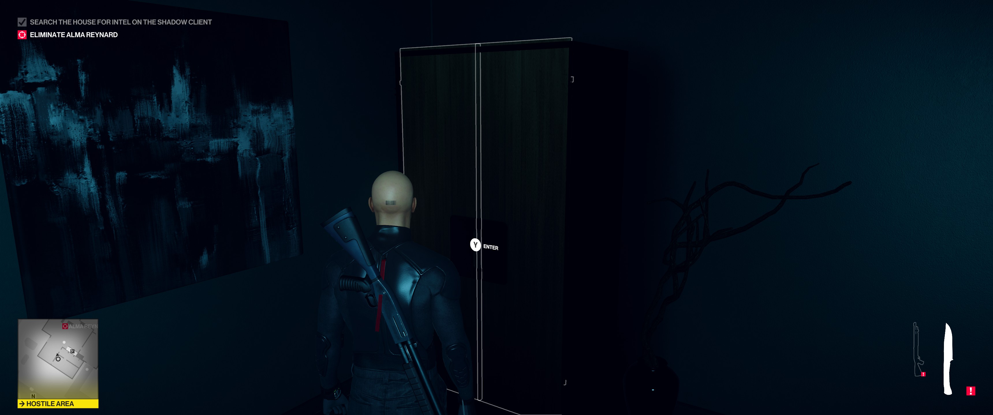 Soon enough, Alma will ask one of her thugs to make her some tea—with honey. Stay patient and quiet; she’ll make a phone call, then meander over to her tea, which you showed remarkable foresight in “modifying” earlier. Once she does, you’ll hear her complain that she needs to find a bathroom. Wait until she enters the bathroom you just passed through, then sneak up behind her. You can either drown her in the toilet, or use the fiber wire to garrote her. Don’t shoot her or use a bladed weapon—her guards might notice blood on the floor and raise an alarm. Be sure to hide her body in the closet you were just hiding in.