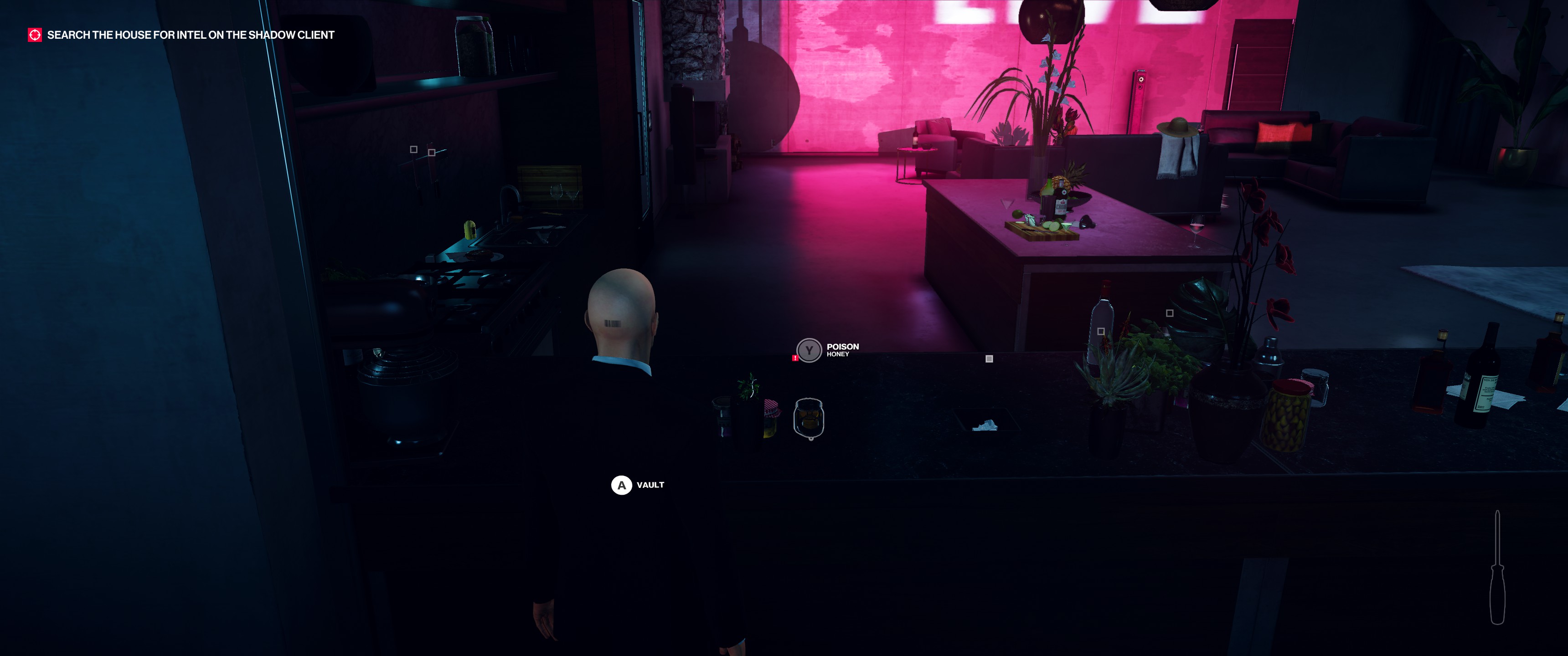 Once inside, you’ll need to find four pieces of intel. Before you get too far into the house, though, be sure to snag the emetic rat poison from one of the shelves in the garage storage area. The kitchen is the next room you’ll come to; use the rat poison on the jar of honey on the counter (you’ll thank me later).
