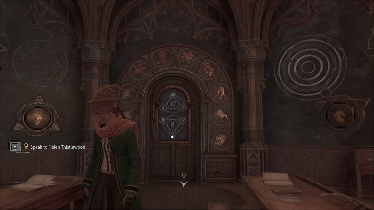 In Hogwarts’ Library Annex, there is an Arithmancy door surrounded by books and a chalkboard. On the chalkboard is an example of the door puzzles. Next to the chalkboard is a chest, and inside is a cipher note with the values of each creature symbol that surrounds the nearby door. The values start at 0 from the top-left side and end at 9 on the bottom-right side.