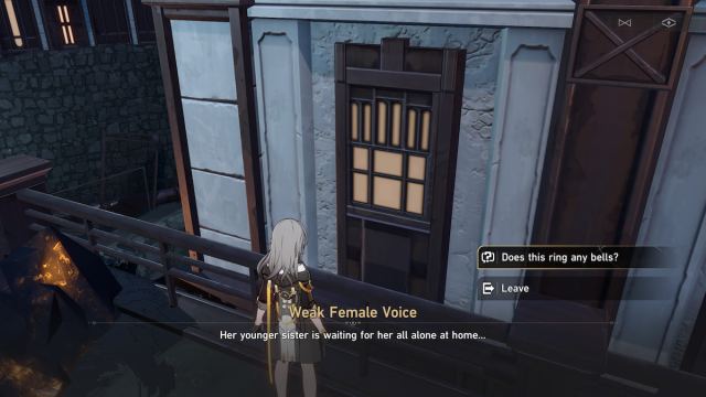 It’s where a Weak Female Voice will call out for her big sister from behind a nearby window. She’ll ask for your help in finding the woman with a headband and a bell.