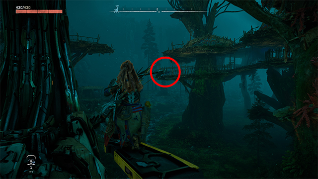 Continue left across the rope bridge. Here, Aloy will mention that “this might be high enough to jump on the Tallneck, but it’s not enough to reach the head. The Tallneck is missing some parts, and you can’t climb to the top at this point. Instead, jump over to the Tallneck, and ride it to the northwestern corner of the outpost. Jump over to a platform there.