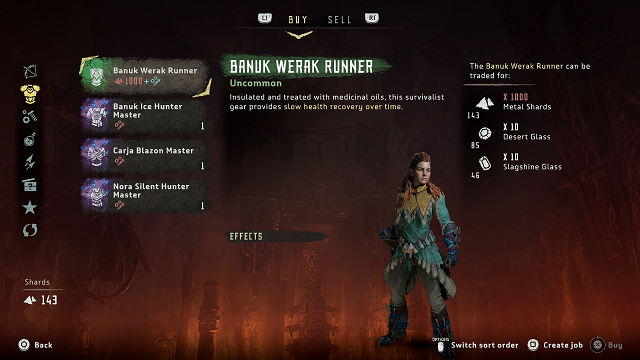 You can purchase the Banuk Werak Runner armor for 1,000 metal shards, 10 desert glass, or 10 slashine glass.