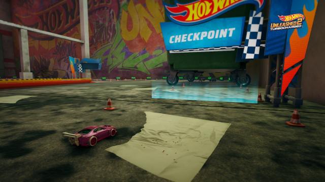 What makes it easy is that it has one of the biggest and easiest shortcuts in the game that bypasses half the track. You’ll find it about midway through as you race on the ground and beneath a couple of dumpsters. After passing the checkpoint here, you’ll find another one close by and just a bit further. Feel free to keep between the cones as you drift around the corner and approach the next checkpoint.
