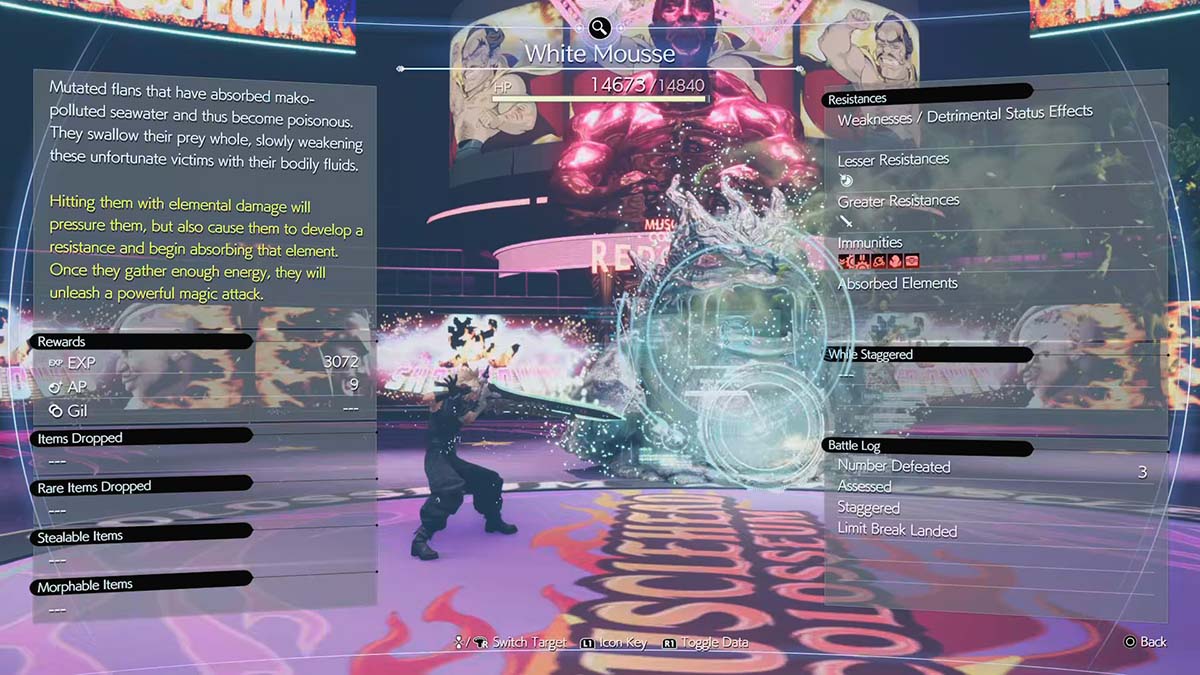 The kicker for White Mouse is that once you hit them with a particular element, they’ll take a moment to build a heavy resistance to that element. Trying to use Fire on a Fire-Resistant White Mousse will give you the same result as if you hit it with Cloud’s Sword or Tifa’s fists: not much value.