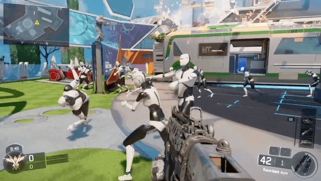 Rush around to all 28 mannequins and blow off all of their arms with a steady stream of gunfire. Keep in mind that there is a timer on the challenge. If you can’t destroy 56 robot arms in the first two minutes of the match the game will need to be restarted. This is where having a friend comes in handy (Ha-ha, get it? Handy?).