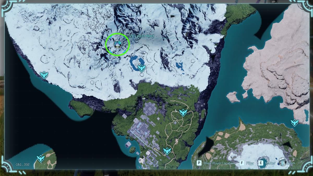 If you don’t want to breed a Lyleen Noct in Palworld, you can catch one. For this method, go to the Iceberg Mineshaft in the snow-capped biome to the north. The coordinates are X: -165, Y: 341, and the closest fast travel point is the Unthawable Lake.