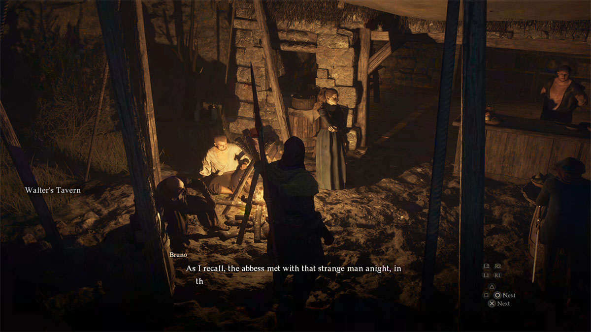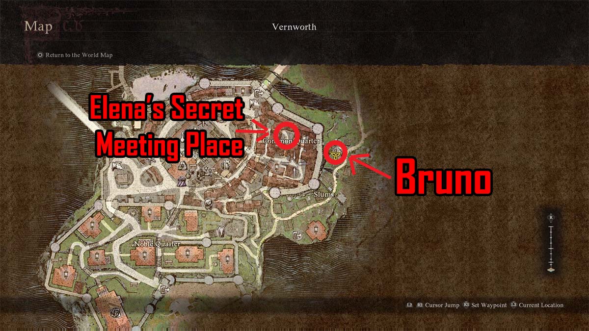 - Speak to Jehan and Bruno: They’re located just down the street from the Gracious Hand building at a local tavern. They’re to the left of the bar. By speaking to them, you’ll learn that Elena meets with a mysterious figure at nighttime.
