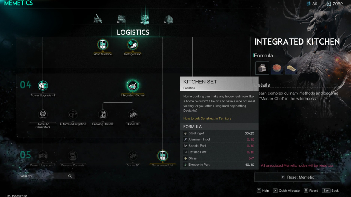 - Kitchen Set: You’ll need to unlock the Kitchen Set by unlocking the Integrated Kitchen node in the Logistics tree of the Memetics menu.