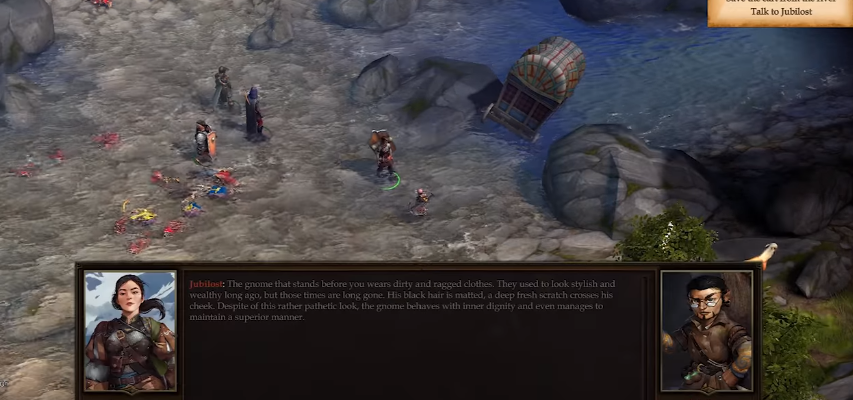 Update: if you pass the skill checks to pull his wagon out of the river and then pick the nice dialog options, Jubilost will join you immediately if you pick the option to ask him to team up to explore the ruins and you don’t actually have to take him there.
