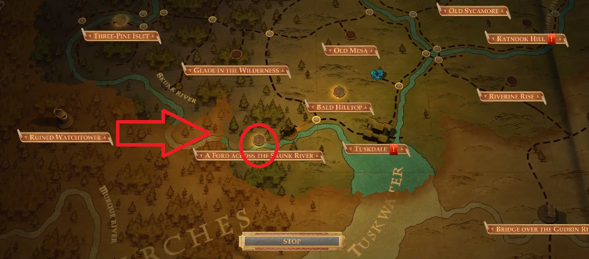 After gaining access to the kingdom management screen, head to the ford across the Skunk River (southwest from your capital and heading towards the Dwarven Ruins).