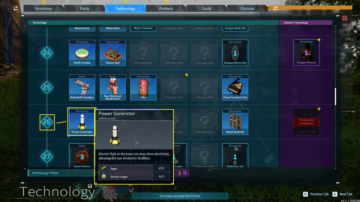 The Electric Egg Incubator automatically sets the perfect temperature that you need for each egg, allowing you to have the fastest hatching time that you can get every time. To unlock the crafting recipe, you need to reach Technology level 36. Rather than the normal Technology points, you will need Ancient Technology points to get it. This means you have to fight some Alpha Boss Pals. The Electric Egg Incubator costs 5 Ancient Technology points, so try to stock up ahead of time by venturing around to those bosses.