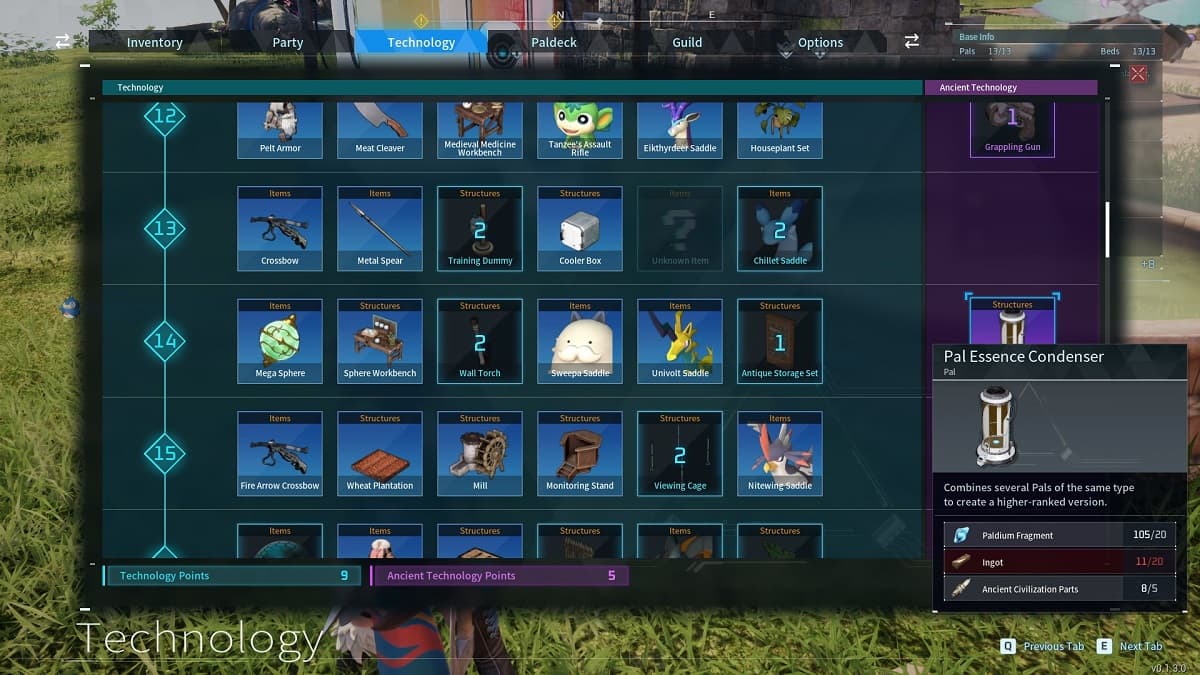 Unlike most items that you purchase in the Technology Tab, the Pal Essence Condenser requires Ancient Technology Points to unlock. It becomes available at Level 14 and costs one point. To build it, you need x20 Paldium Fragments, x20 Ingots, and x5 Ancient Civilization Parts.