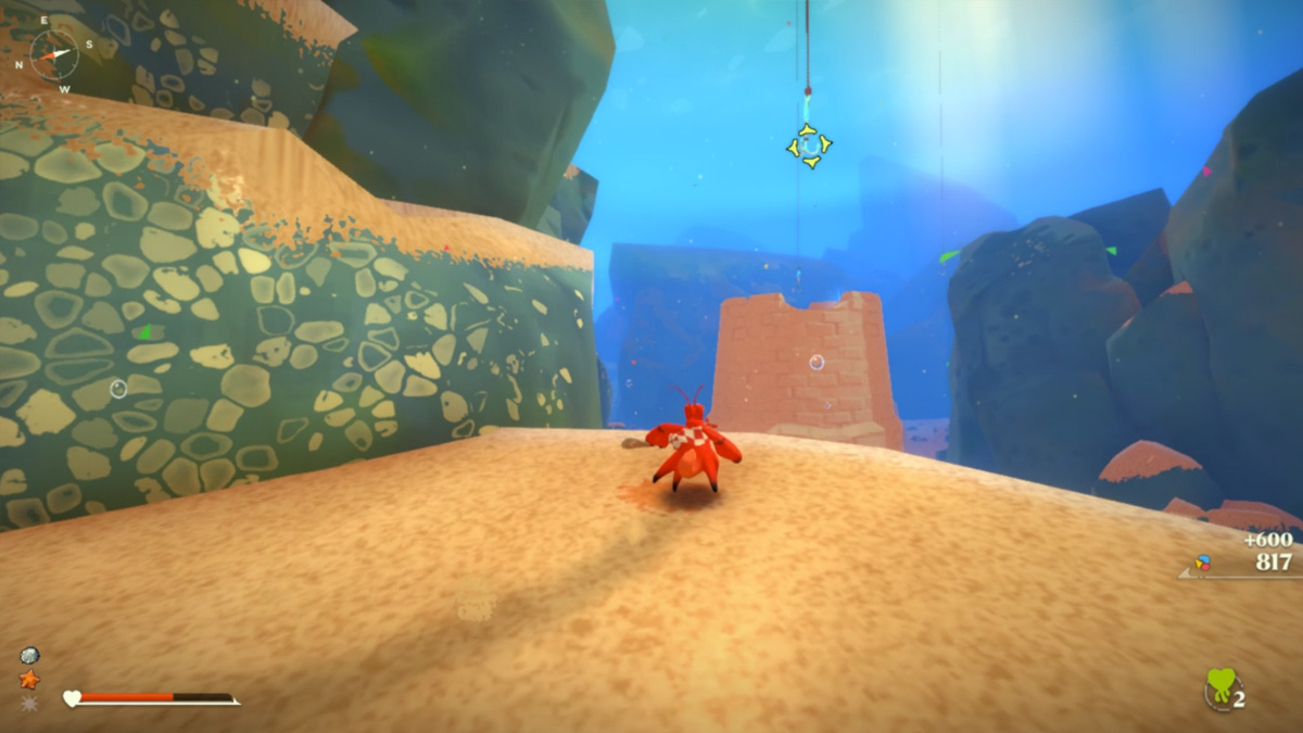 Jump and swim to it a little mid-air before grappling to it. You’ll find the Another Crab stowaway at the top of the tower you’re swinging to. Generally speaking, powerful stowaways like this will glow orange as pick-ups.