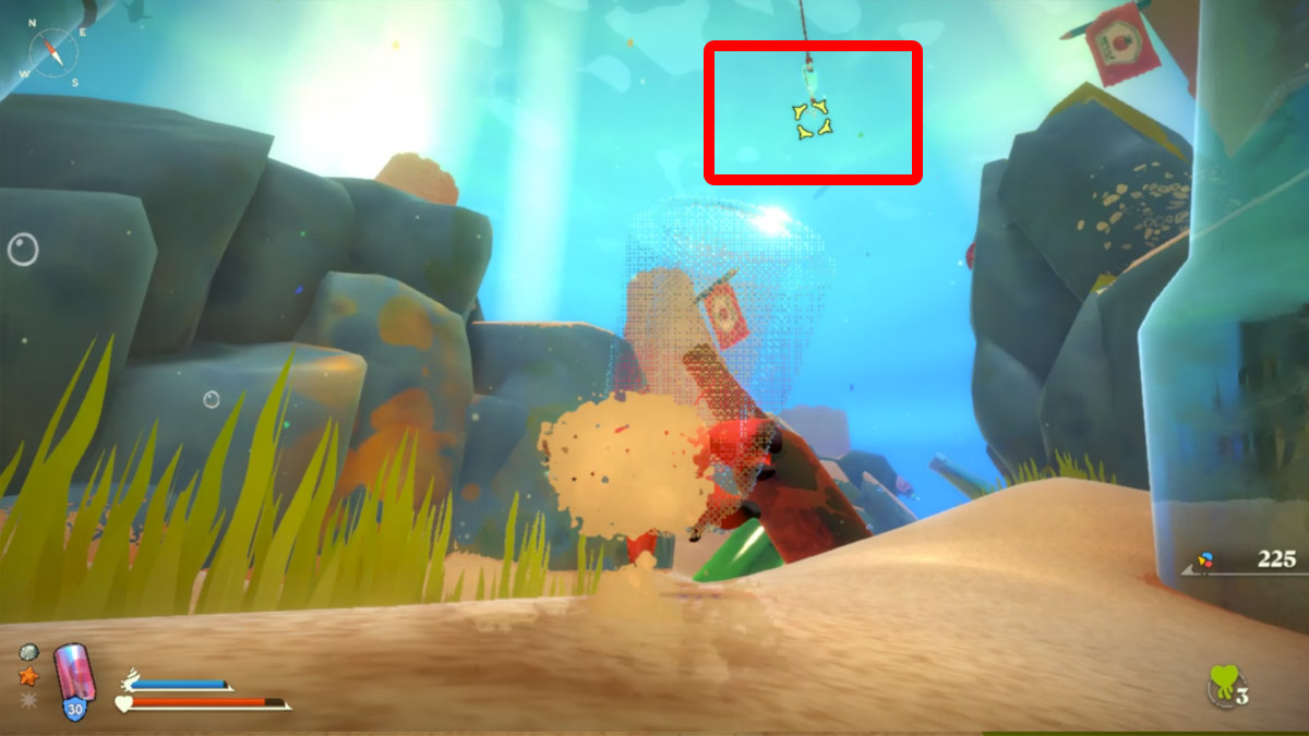 Grapple toward the hook and then swim to the right. You’ll face a corrupted comb crab. I suggest charged attacks to take it down and blocking its slow attacks with your shell. Continue past it to a series of grappling hook points, as shown in the picture below. Follow them, and you’ll find a 2500 microplastic sellable trinket along the way.