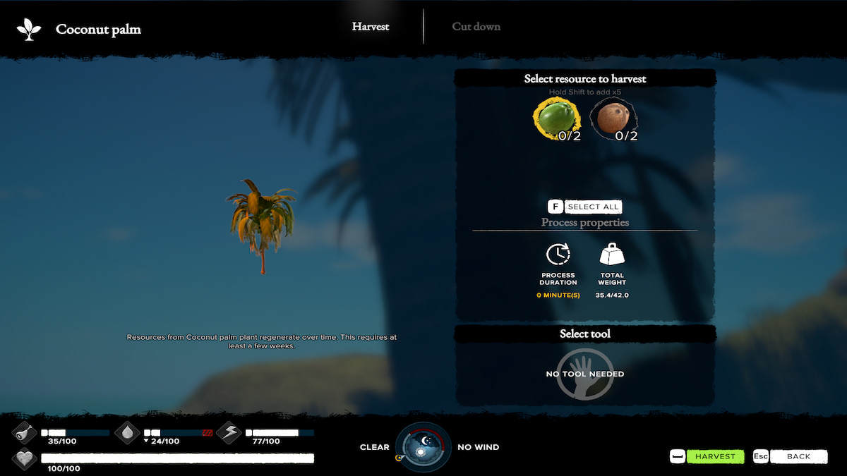 To harvest them from the tree, approach the tree and press E. Then, select all the Green Coconuts that are available. You’ll also usually find Ripe Coconuts that restore hunger and thirst. However, Green Coconuts will give you more water. After selecting all of them to harvest, press Spacebar to start the harvesting process. Some time will pass by as you do.