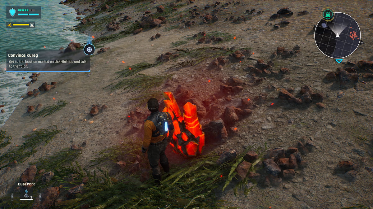 Red Helidium is almost exactly like Green Helidium but powers your Rifle. Similarly, it works as a powering agent for the gun, boosting its damage and allowing you to use your modules; without it, your gun isn’t effective. You can find Red Helidium in large clusters of crystals around the map or as singular crystals around the villages. They break the same way as well, using your melee attack to collect the fragments.