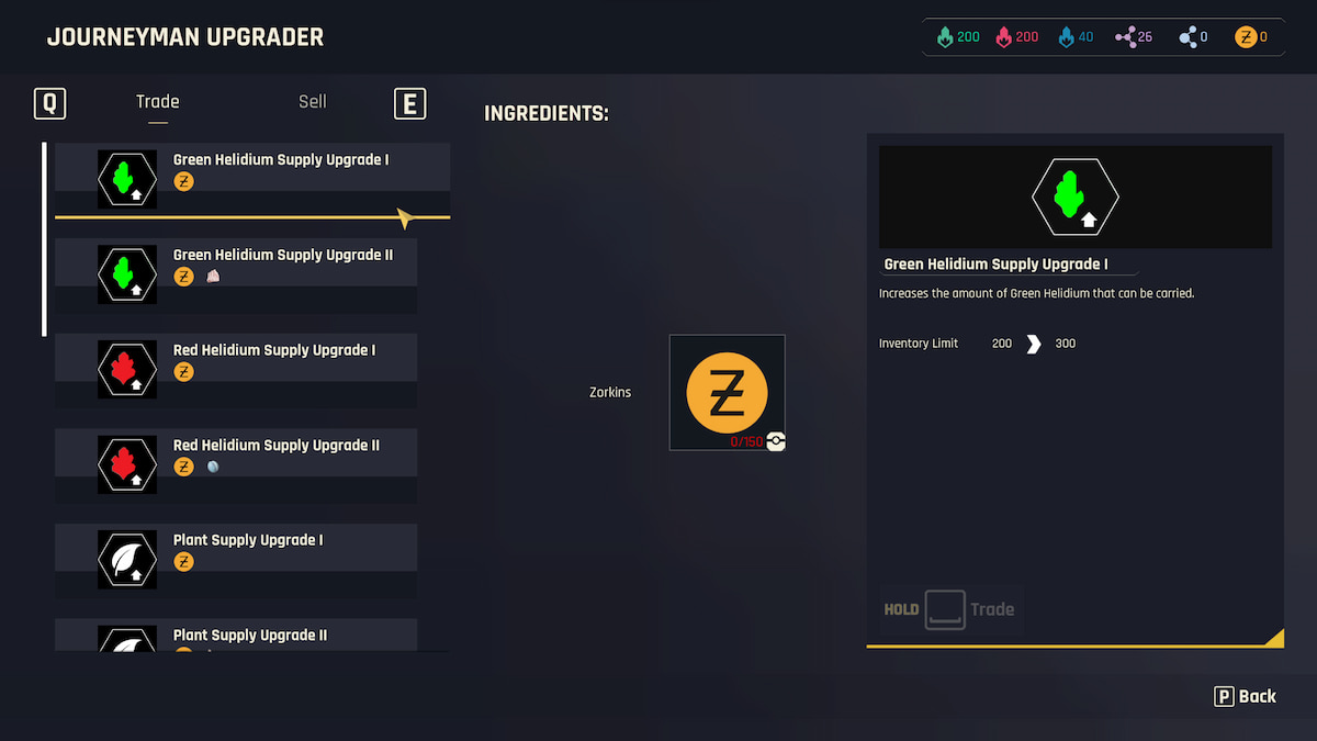 | Green Helidium Supply Upgrade II | 400 Inventory Limit | 200 Zorkins Gamor Meat x2 |