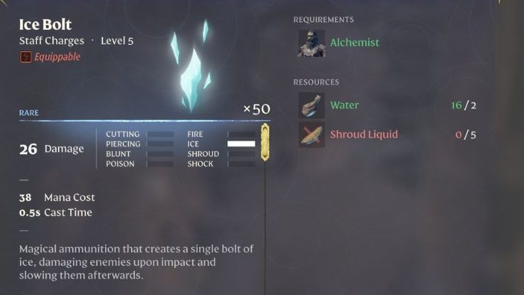 The first Staff ammo recipe you receive is for x50 Ice Bolt (x2 Water, and x5 Shroud Liquid). The spell deals x26 Ice damage and becomes available at Level 5. Thankfully, the ingredient list is pretty simple to get you started as a Battle Mage, particularly if you set up a base near a Well to harvest water. If you’re an eager wizard like me, you’ll be happy to know there are more spells as you progress in Enshrouded. Here are all of the Spell Charges in the game.