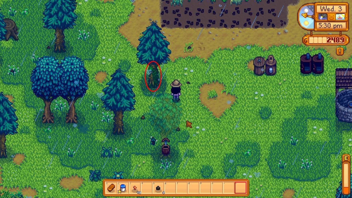 Moss is a necessary component for a handful of crafting recipes. It’s found on wild trees, specifically pine trees, and can be gathered in all seasons except Winter. It randomly spawns but can consistently be found in Cindersap Forest and near the Mines. It even appears on wild trees growing on your farm plot.