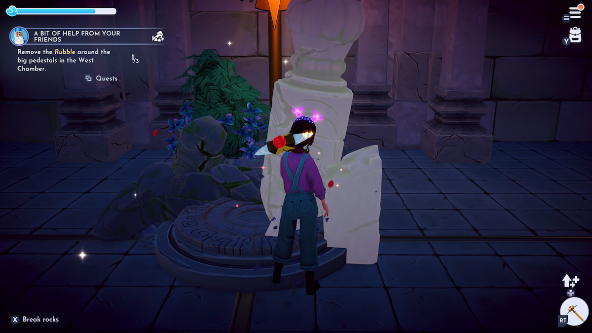 Once you have all the Flickers, return to Merlin for your next step. You’ll venture into the Shrunken Ruins with Merlin, and here, Merlin will ask you to take quick snapshots of three chambers. Then, you’ll gain three sub-quests to complete for the main quest, “A Bit of Help From Your Friends.” In these three quests, you’ll need to complete a quest for Rapunzel, Gaston, and EVE, corresponding to each chamber in the Shrunken Ruins.