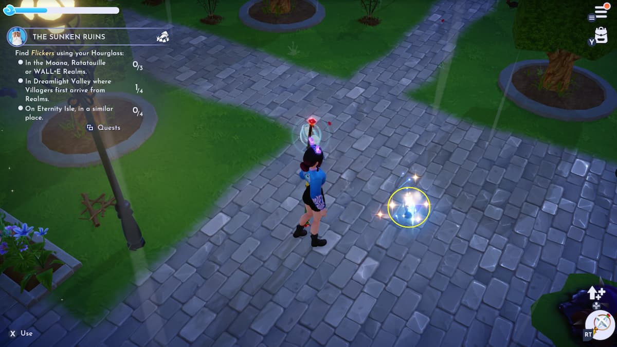 The first step of the “The Sunken Ruins” quest is to meet Merlin in his Library, aka his player home. This is most likely back in Dreamlight Valley unless you’ve moved it to the new island. After talking to him, he’ll give you the task of collecting 11 Flickers.