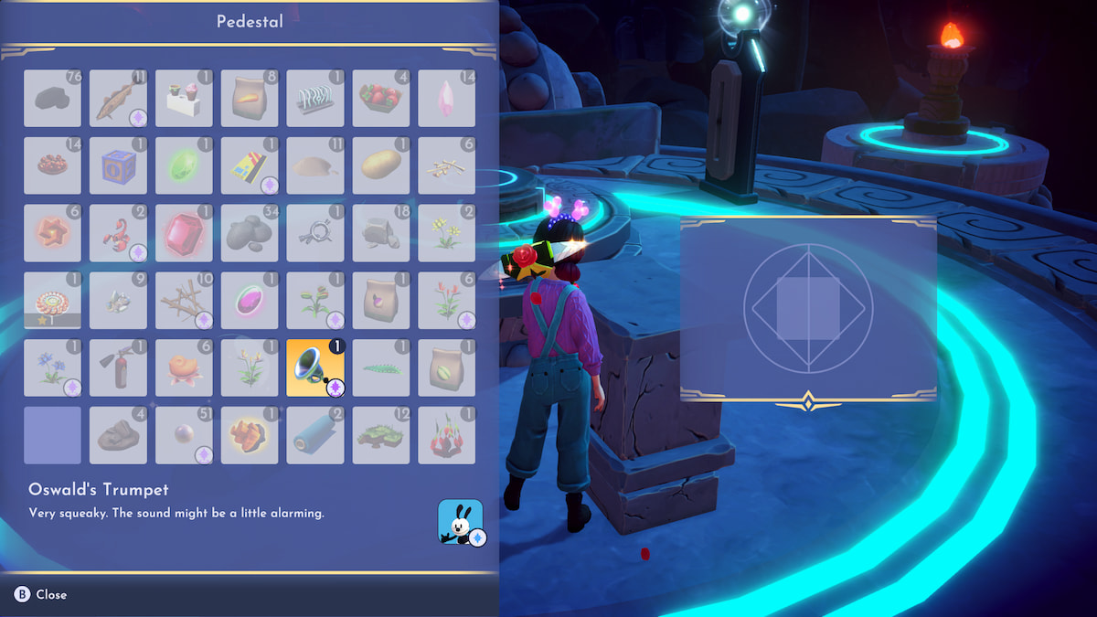 - 12. Place the Horn on the stone pedestal beside the center wheel of the platform and interact with it to make Oswald drop another Exclamation Mark.
